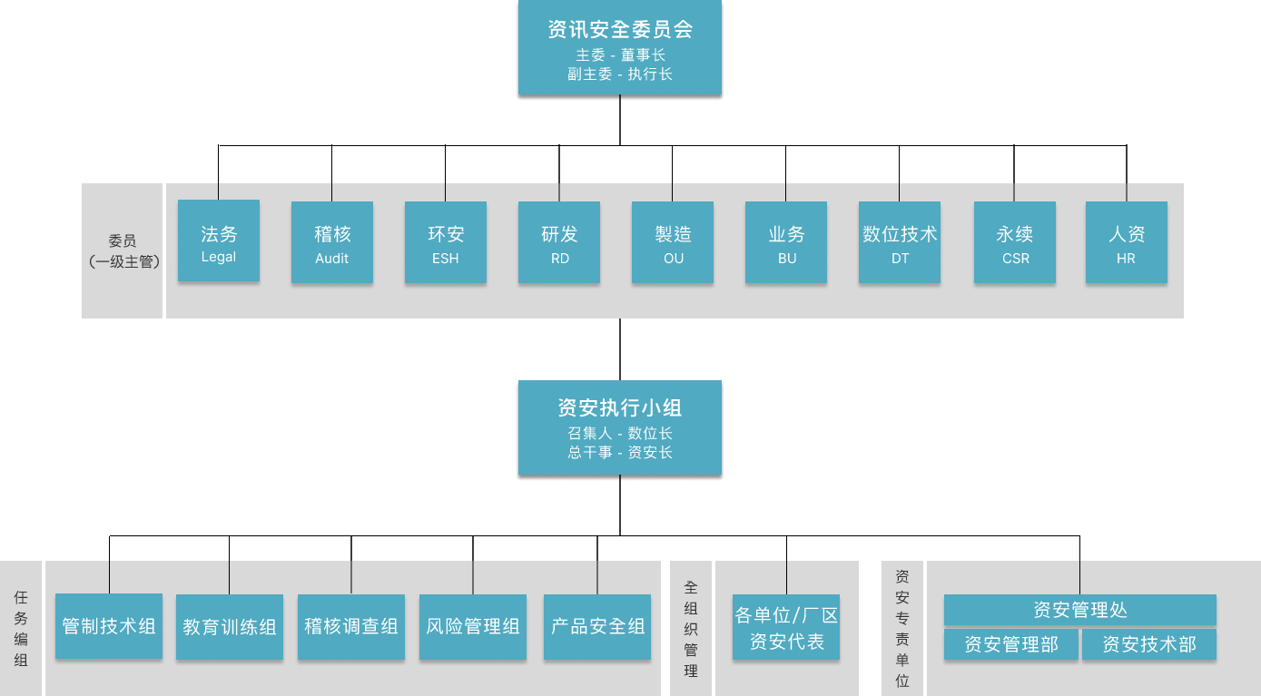 资讯安全委员会为PT视讯(中国区)官网资安最高管理组织,向董事长报告。下辖资安执行小组负责推行资讯安全委员会之各项决议。为持续建构完整且精实的资安专 责团队,资讯安全管理处下成立「资讯安全管理部」与「资讯安全技术部」,持续投入资源以强化团队资安核心能力。