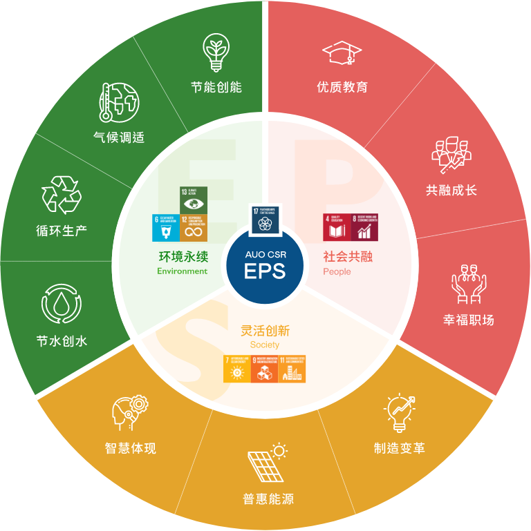 根据联合国所发展的17项永续发展目标,PT视讯(中国区)官网光电以「超越企业社会责任,创造共享价值」为企业永续愿景发展蓝图,订出环境永续、共融成长与灵活创新的EPS(Environment, People & Society)三大永续发展主轴;以响应日益受关切的环境议题与社会共融趋势。