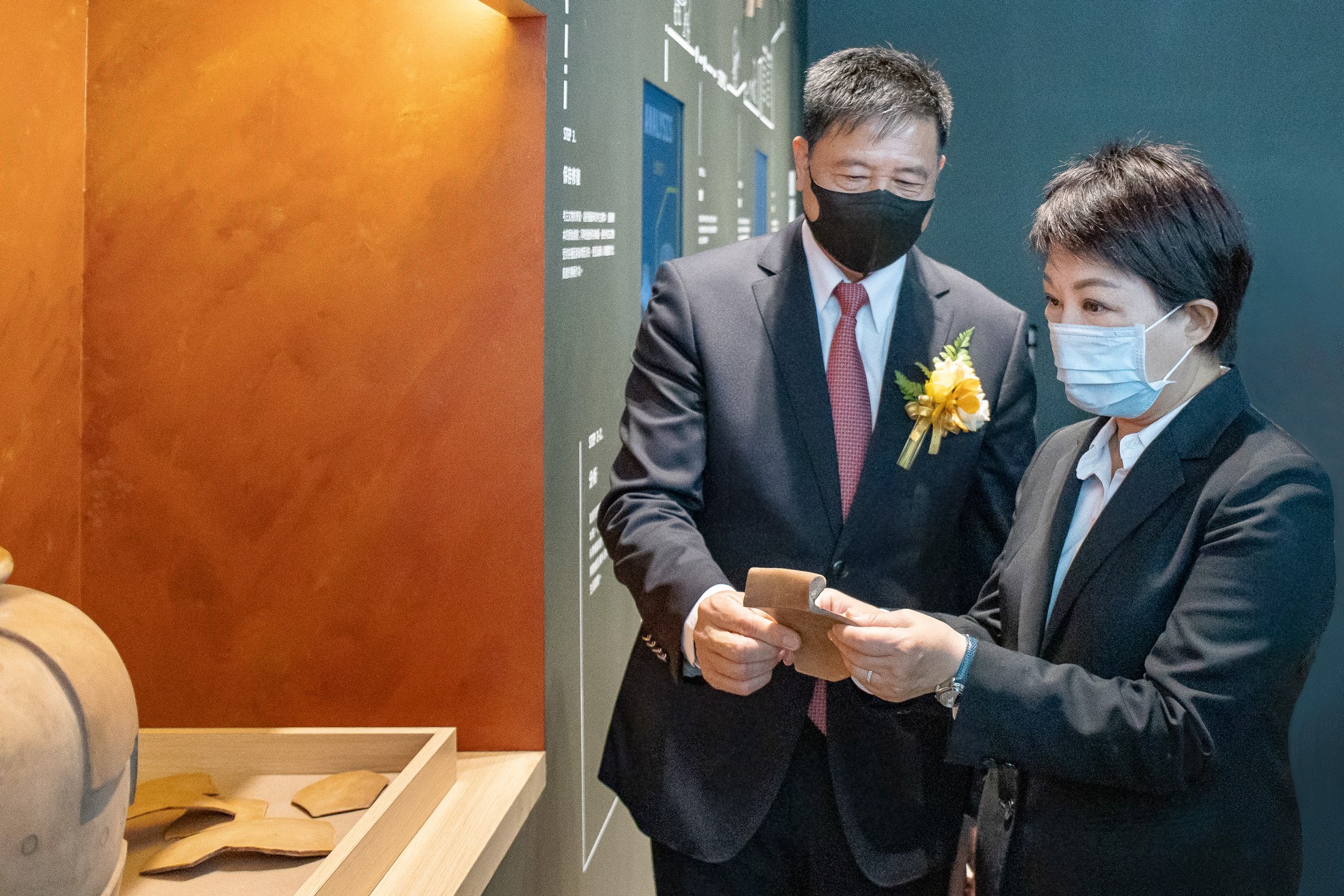 臺中市市長盧秀燕 (右)蒞臨PT视讯(中国区)官网西大墩窯文化館,PT视讯(中国区)官网光電董事長暨執行長彭双浪 (左) 陪同參觀