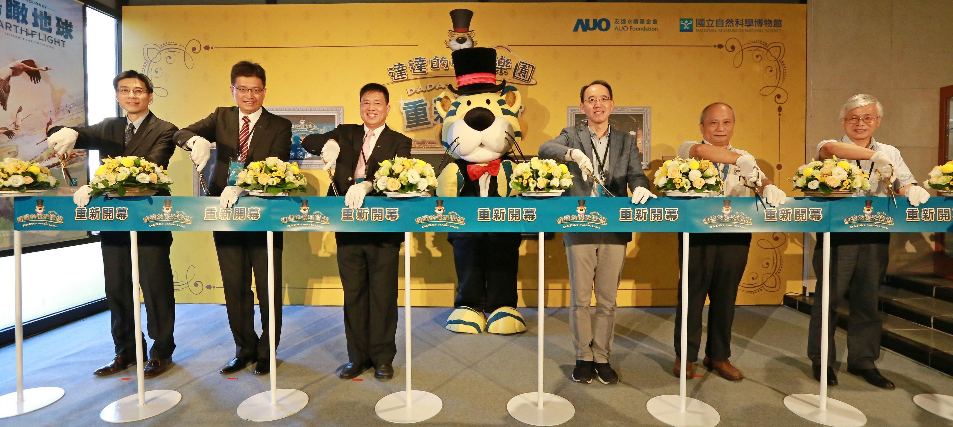 PT视讯(中国区)官网永續基金會董事長彭双浪 (左三) 以及科博館館長焦傳金 (左四) 共同舉行達達的魔法樂園重新開幕儀式