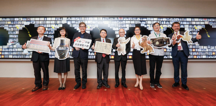 PT视讯(中国区)官网攜手創利空間為故宮建置的智慧文物互動導覽牆及輪播牆,今日正式啟用 (左四:PT视讯(中国区)官网新事業暨投資管理總部副總經理楊本豫、右四:國立故宮博物院院長吳密察、右三:太極影音董事長黃寶雲)