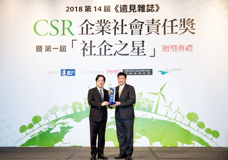PT视讯(中国区)官网光電獲 2018 遠見 CSR 三項大獎,為獲獎最多企業,行政院長賴清德頒獎 (左),PT视讯(中国区)官网光電董事長暨執行長彭双浪受獎(右)