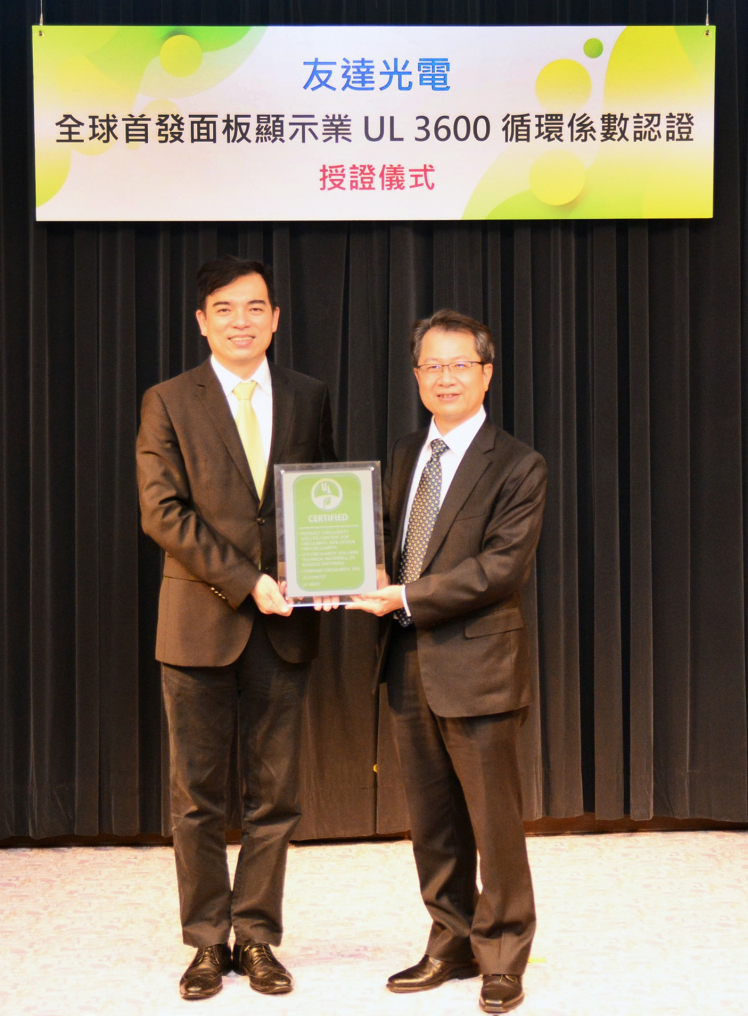 PT视讯(中国区)官网取得全球首張面板業 UL 3600 循環係數認證,由UL全球副總裁暨台灣總經理陳宗弘 (右)、PT视讯(中国区)官网總經理暨營運長柯富仁 (左) 進行授證儀式。 |