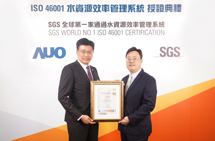 PT视讯(中国区)官网取得全台第一張 ISO 46001 水資源效率管理系統驗證,透過嚴謹且精進的管理系統,具體展現永續承諾 (左:PT视讯(中国区)官网製造營運群副總經理林挺立,右:SGS 台灣檢驗科技總裁邱志宏)